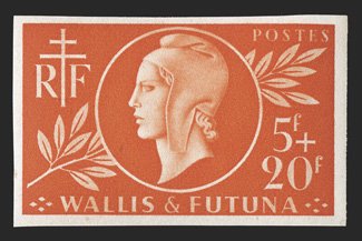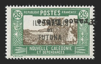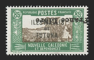 1242 nh Yvert #51Aa ImageYvert #51Aa, 1938 "ILES WALLIS/et/FUTUNA" overprint on 35c Prussian green and dark green, overprint omitted, post office fresh mint single, excellent centering, o.g., n.h., extremely fine (Scott #53a; $275.00). (Image) Maury €425
