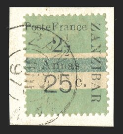 121 p Yvert #42 ImageYvert #42, 1897 "2½" and "25c." Ty. I Surcharge on Pale green sheet-margin, perforated on all four sides, used as are all known examples, tied to piece by clear 28 July 1897 c.d.s., very fine and rare; only 50 stamps were issued; signed Kohler twice (Scott #34; $1,300.00). (Image) €1,500