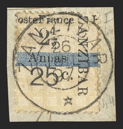 124 p Yvert #44 ImageYvert #44, 1897 "2½" and "25c." Ty. I Surcharge on Pale blue sheet-margin, perforated on all four sides, used as are all known examples, tied to small piece by clear 26 July 1897 postmark, very fine and exceedingly rare; with only 10 copies printed; signed A. Brun and Roumet and accompanied by 2007 Roumet certificate (Scott #36; $3,000.00). (Image) €3,700