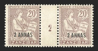 128 og/nh Yvert #47-52 ImageYvert #47-52, 1902-03 "½/ANNA" to "3 ANNAS" Surcharges on 5c-30c Definitives horizontal gutter pairs with millesimes, except 10c a block of four, fresh and intact, o.g., 1a and 3a n.h., fine-very fine set (Scott #39-44 vars.). (Image) Maury €1,375