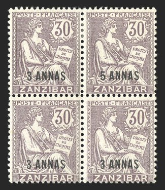 129 og/nhbl Yvert #52a ImageYvert #52a, 1903 "5 ANNAS" Error surcharge on 30c Lilac, fresh mint block of four, the top right stamp the error and the other three normal, o.g., light h.r., bottom stamps n.h., fine and scarce (Scott #44a; $364.00 for singles). (Image) Maury €600