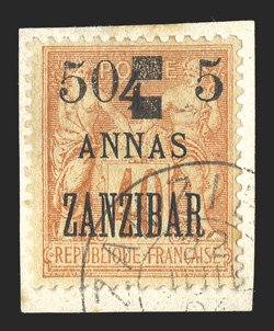 126 O Yvert #45 ImageYvert #45, 1897 "5" and "50c." Ty. IV Surcharge on Brown sheet-margin, perforated on all four sides, used as are all known examples, neat 28 July 1897 postmark, very fine and rare; a mere 20 examples were printed; signed Calves, Champion twice, J-F Brun and others (Scott #37; $2,900.00). (Image) €3,700