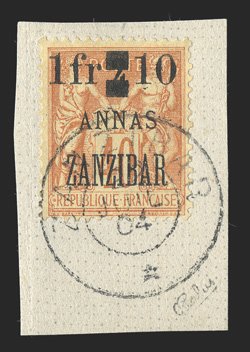 134 p Yvert #62 ImageYvert #62, 1904 "1fr" and "10" Surcharge on 4a on 40c Red on straw, used as are all known examples, tied to piece by neat 22 July 1904 c.d.s., very fine and rare; only 50 examples were produced; signed Calves and accompanied by 2002 Roumet certificate (Scott #54; $2,000.00). (Image) €2,300