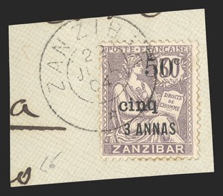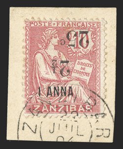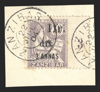 138 p Yvert #67 ImageYvert #67, 1904 "1fr." and "dix" Surcharge on 3a on 30c Lilac, used as are all known examples, single with right gutter margin containing millesimes "3", tied to piece by clear 22 July 1904 postmarks, fine; with only 50 stamps having been surcharged this is the only millesimes example possible; signed A. Brun and Roumet and accompanied by 2010 Roumet certificate (Scott #59; $2,000.00+). (Image) €2,300+