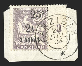136 p Yvert #65 ImageYvert #65, 1904 "25c" and "2½" Surcharge on 3a on 30c Lilac, used as are all known examples, single with right gutter margin containing millesimes "3", tied to piece by clear 22 July 1904 datestamp, fine; with only 50 stamps having been surcharged this is the only millesimes example possible; signed Champion, Gilbert and Roumet and accompanied by 2010 Roumet certificate (Scott #57; $2,400.00). (Image) €2,600+