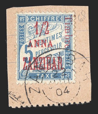 140 p Yvert #68 ImageYvert #68, 1904 "Timbre" Overprint on ½a on 5c Blue postage due, used as are all known examples, tied to piece by neat 22 July 1904 postmark, very fine and scarce; only 300 stamps were overprinted; signed Calves and Gilbert (Scott #60; $450.00). (Image) €530