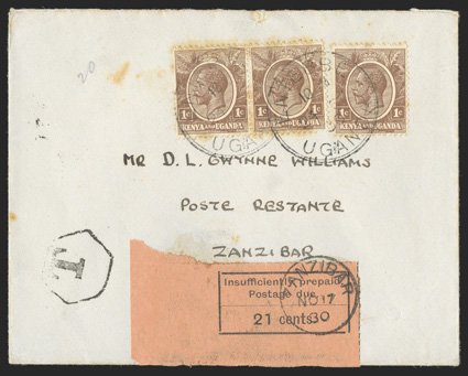 162 c S.G. #D12 ImageS.G. #D12, 1931 21c Black on orange postage due, bottom left corner margin single tied by Zanzibar NO 17 30 c.d.s. on incoming cover from Uganda, with three Kenya and Uganda 1c King George V tied by Entebbe Sep 24 c.d.s. postmarks, "T" handstamp and Zanzibar receiving backstamp, 1c stamps with some gum staining, otherwise fine (Scott #J8). (Image) Scott $500.00