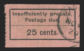 163 O S.G. #D13 ImageS.G. #D13, 1926-30 25c Black on magenta, a used single of his very rare value, from the bottom right corner of the sheet with sheet s.e. on those sides and rouletted 10 on the other sides, portion of November 1929 Zanzibar c.d.s., brownish gum from post office glue pot remains on the reverse as these stamps were issued without gum, very fine; an extremely rare stamp mint or used and, despite the difference in catalog values, it is probably rarer; ex-Neal Allen (Scott #J8b; $1,500.00). (Image) £1,300