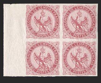 165 og/nhbl Yvert #1-6 ImageYvert #1-6, 1859-65 1c-80c Eagle and crown cplt., wonderfully fresh and handsome set of sheet-margin mint blocks of four, all with large even margins on the other three sides, o.g., top stamps l.h. or h.r. and the bottom pairs all n.h., extremely fine; a very desirable set of blocks (Scott #1-6; $1,275.00 for hinged). (Image) for hinged €1,355