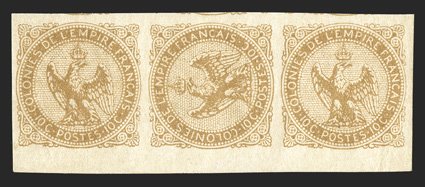 166 nh/og Yvert #3a ImageYvert #3a, 1859 10c Bister on yellowish, one sideways, incredibly fresh bottom sheet-margin mint strip of three, the center stamp sideways, large to very large margins, strong color on crisp clean paper, o.g., right stamp very lightly hinged and with a natural translucent spot, the left se-tenant pair never hinged, extremely fine; signed Pavoille (Scott #3a; $1,032.50 for hinged). (Image) for hinged €1,135
