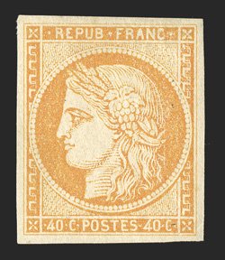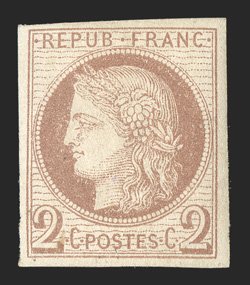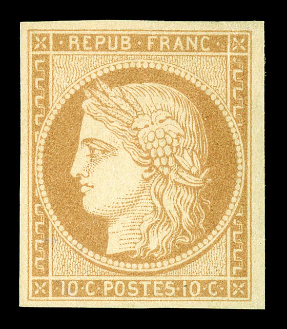 180 og Yvert #36A ImageYvert #36A, 1877 1Fr. Bronze green on straw, Ty. II, a pleasing mint example of this scarce type, uncommonly large margins, rich color, o.g., h.r., extremely fine; signed Calves (Scott unlisted). (Image) €2,200