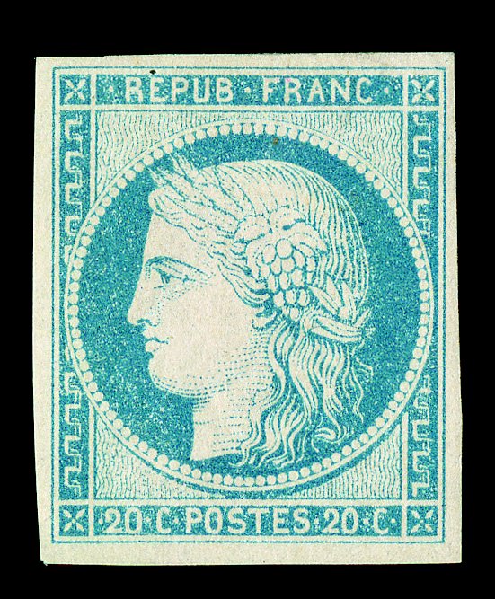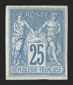 178 og Yvert #35 ImageYvert #35, 1878 25c Blue on bluish, Ty. II, remarkably, the Wyer collection contains a second choice mint example of this rare general issue, possessing uniformly large margins all around, rich distinctive blue color and a fine impression, full clean o.g. which has only been very lightly hinged, extremely fine; signed Calves and Roumet and accompanied by 1997 Behr certificate (Scott #35a; $4,250.00). (Image) €5,000