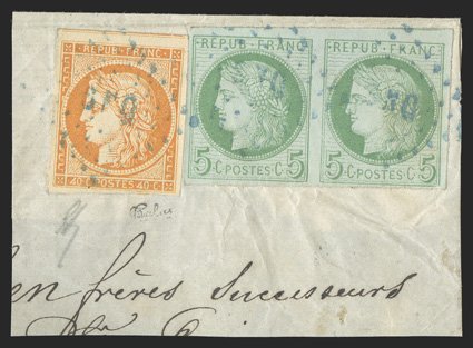 170 p Yvert #13a, 17 ImageYvert #13a, 17, 1871-72, 40c Orange on yellowish, Ty. II and 5c Green on pale blue, single of former and horizontal pair of latter, both with ample to huge margins all around, tied to piece by blue "SNG" in lozenge cancel of Senegal, very fine; signed Calves and accompanied by 2002 Behr certificate; ex-Gilbert (Scott #14a, 19; $659.50). (Image) €722