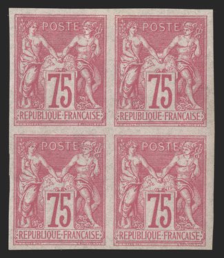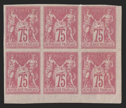 175 og/nhbl Yvert #28 ImageYvert #28, 1878 75c Rose on rose, Ty. I, bottom right corner margin mint block of six (3x2), with large margins on the other sides, bright and fresh, o.g., h.r. or l.h., bottom center stamp n.h., very fine (Scott #28; $450.00 for singles). (Image) €610