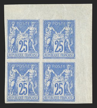 179 nhbl Yvert #36 ImageYvert #36, 1877 25c Ultramarine on bluish, Ty. II, handsome top right corner margin mint block of four, with large margins on the other sides, remarkably fresh, o.g., n.h., extremely fine; each signed A. Brun (Scott #35; $420.00 for singles). (Image) for hinged €300