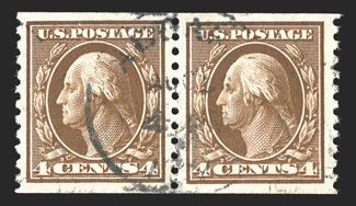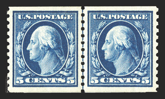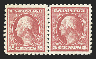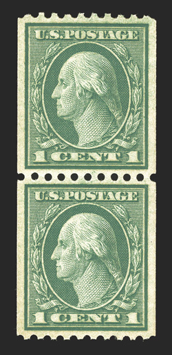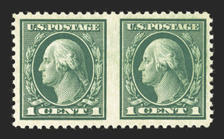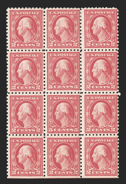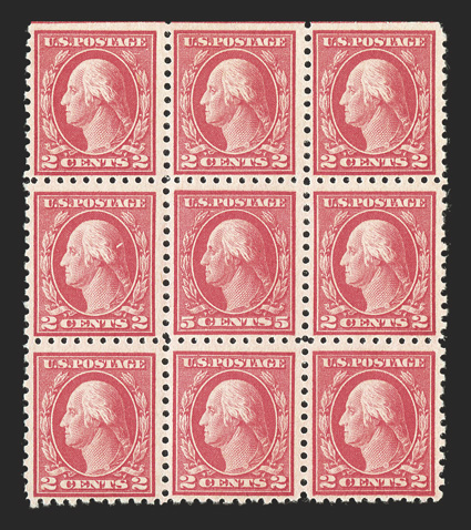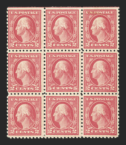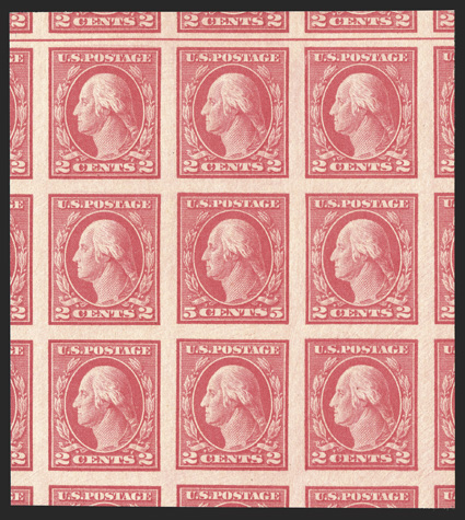 The 1917 Five Cent Imperforate Error is one of the key 20th Century rarities of United States philately. It has been recorded by George B. Sloane that a total of 48 uncut imperforate sheets of 400 of plate no. 7942 were sold out of the New York City Post Office, each sheet containing a single error and a double error, making 48 the maximum number of either error block that could possibly exist. Over the years, some of these blocks were cut up for singles or miscut altogether, making undesirable blocks of six for instance. Also, due to the wartime printing methods, several suffer from large inclusions, gum bends or skips and other production maladies. Still others were hinged or thinned at one time. The block offered here is as choice as can exist, an opinion shared by the Professional Stamp Experts, who awarded this block the ultimate grade of Gem 100 Jumbo, the only such block to be so graded.
