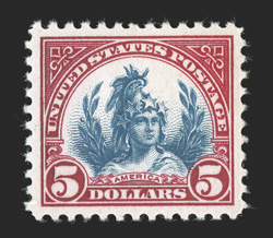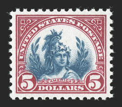 323 nhu 573 Image#573, $5.00 Carmine and blue, striking top left corner margin single, marvelously well centered and margined, brilliantly rich colors, pristine o.g., n.h., an extremely fine gem; 1999 PF certificate and a 2003 PSE certificate (Superb 98; SMQ $1,200.00); this is the highest grade the PSE has assigned to this stamp. (Image) $220.00