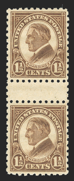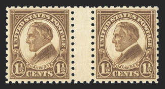 328 nh 582 var. Image#582 var., 1½c Brown, horizontal pair with full vertical gutter, exceptionally well centered and with deep intense color, o.g., n.h., extremely fine; exceedingly rare and undervalued, only one other has been certified by the Philatelic Foundation (hinged and with faults); 2004 PF certificate. (Image) $210.00