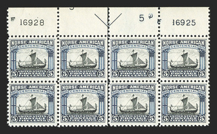 331 nhPB 620-21 Image#620-21, 2c and 5c Norse-Americans cplt., top margin plate number blocks of eight, the 5c with especially large top margin, bright and fresh, o.g., n.h., fine-very fine. (Image) $1,050.00