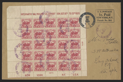 332 FDC 630 Image#630, 2c White Plains souvenir sheet, tied to first day cover by "New York Philatelic Station/Oct 19 1926" violet handstamps, and an additional similar handstamp in black, cover addressed to New York, the sheet itself is unusually choice, not only because it is remarkably well centered and fresh, but also because it has full untrimmed margins all around, unlike many first day covers, extremely fine; certainly one of the finest White Plains sheet first day covers available. (Image) $1,800.00