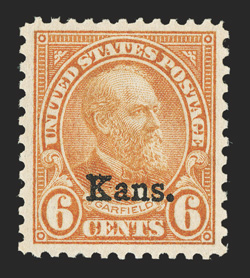 333 nhu 664 Image#664, 6c "Kans." ovpt., uncommonly well centered and margined, strong color, o.g., n.h., extremely fine; 2007 PSE certificate (XF-Superb 95; SMQ $350.00). (Image) $55.00