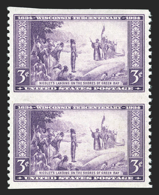 338 og 739a Image#739a, 3c Wisconsin Tercentenary, vertical pair, imperforate horizontally, perfectly centered within large margins, wonderfully bright and fresh, o.g., lightly hinged, extremely fine; an especially scarce error when found this choice; 2004 PF certificate. (Image) $500.00