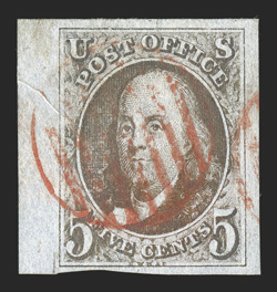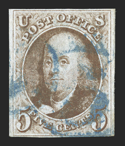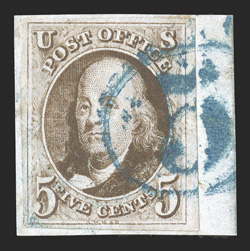 21 p 1 Image#1, 5c Brown, four large margins, strong color in the Brown shade, tied to piece by blue numeral "5" in oval postmark, very fine; 2011 PF certificate. (Image) $650.00