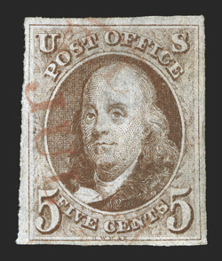 23 O 1 Image#1, 5c Red brown, full to large margins all around, fine impression, cancelled by an unusual red town c.d.s. very fine; 2011 PF certificate. (Image) $725.00