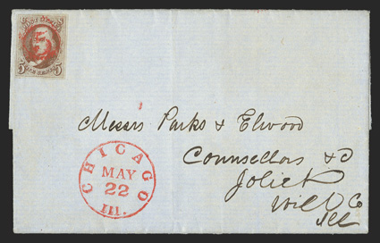 24 c 1 Image#1, 5c Red brown, single with full to mostly large margins around and strong color, cancelled by a brilliant red "5" in serrated oval, matching red "Chicago Ill. May 22" c.d.s. in beautifully struck at the bottom of a blue 1851 folded letter to Joliet, Ill., attorney's printed corner card inside folded letter, extremely fine; a beautiful 1847 cover with outstanding eye appeal; 1992 PF certificate; ex-Dick, Garrett and Kapiloff. (Image) Est. $2,000-3,000