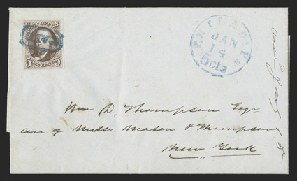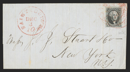 38 c 2 Image#2, 10c Black, impressive single with large margins all around, strong color and impression, tied by red St. Louis c.d.s. postmarks on folded cover docketed 1850 to New York, very fine; an uncommonly choice stamp on cover. (Image) $1,550.00