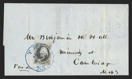 27 c 1a Image#1a, 5c Dark brown, top sheet-margin single, other margins close to large, especially dark color, tied by crisply struck blue "Troy N.Y. Jun. 13" c.d.s. on 1848 folded letter to "University at Cambridge Mass.", very fine and handsome; 2011 PSE certificate; cataloged as a used stamp. (Image) $875.00+