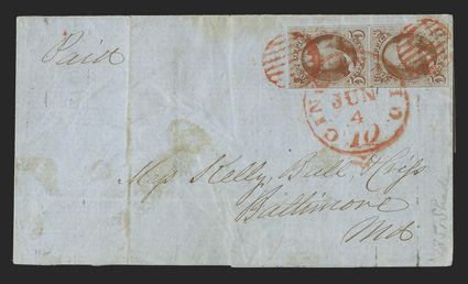 29 c 1b Image#1b, 5c Orange brown, vertical pair, large margins to just touching at bottom right, rich distinctive color, tied by two strikes of red grid and matching "Cincinnati O./June 4" datestamp with integral "10" rate to folded letter to Baltimore, cover with bottom flap missing which is not noted on the certificate, otherwise very fine and attractive; unlisted in the Alexander census; 1998 APS certificate. (Image) Est. $750-1,000