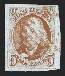 31 O 1d Image#1d, 5c Brown orange, large to huge margins all around, bright color in this distinctive shade, light red grid cancel, extremely fine; an exceedingly choice 1847 Five Cent Brown Orange; 2011 PSAG certificate. (Image) $1,250.00