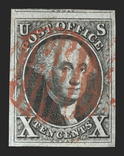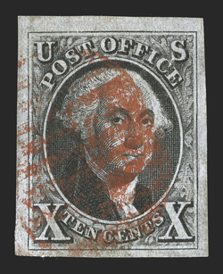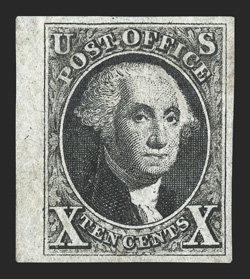 34 Ou 2 Image#2, 10c Black, handsome used single, with full to very large margins all around, outstanding color and an unusually sharp impression, bright red grid cancel, extremely fine; 1982 and 2007 PF certificates, as well as a 2009 PSE certificate (XF-Superb 95; SMQ $2,500.00). (Image) $1,200.00