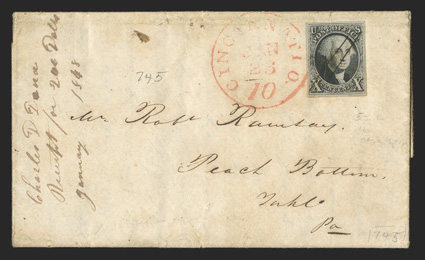 39 c 2 Image#2, 10c Black, large margins all around, strong color and fine impression, cancelled by ms. strokes and tied by red "Cincinnati O./Jan 23" datestamp with integral "10" rate to 1848 folded letter to Peach Bottom, Pa., cover lightly toned, otherwise very fine; 1990 APS certificate. (Image) $1,550.00