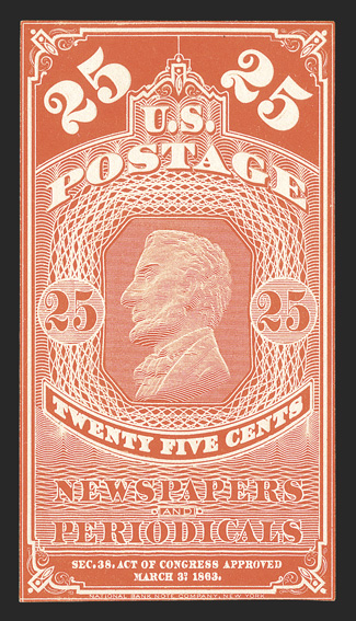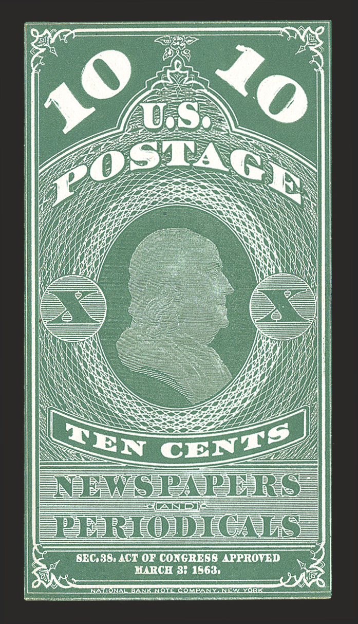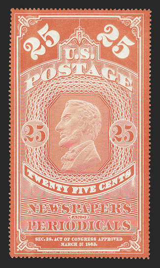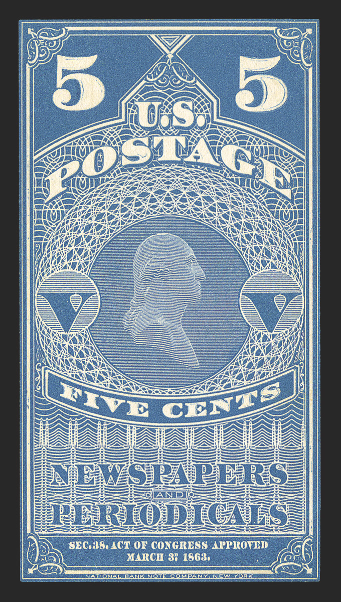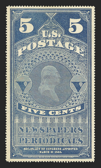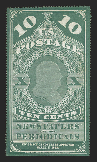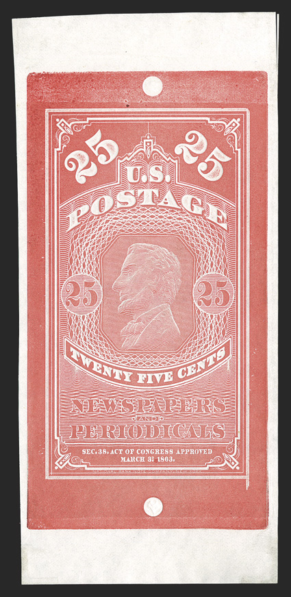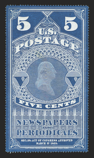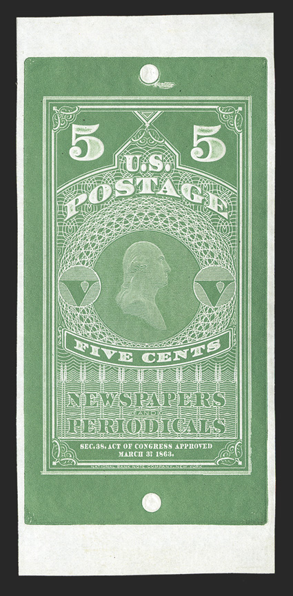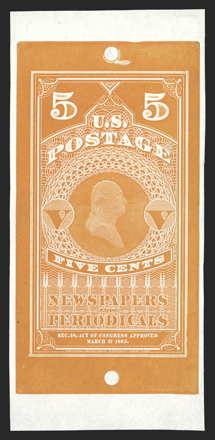 It is generally assumed that 3-5 examples of all the "Panama-Pacific" small die proofs were made. In the case of the First Issue Newspaper series, however, we believe there are only two sets currently in existence. The other set is cut irregularly, making this set the finer of the two. All of the recent newspaper collections offered at auction, such as Warm-Griffiths, Braceland and Kotanchik (which all had comprehensive proofs and essays) did not have a set.