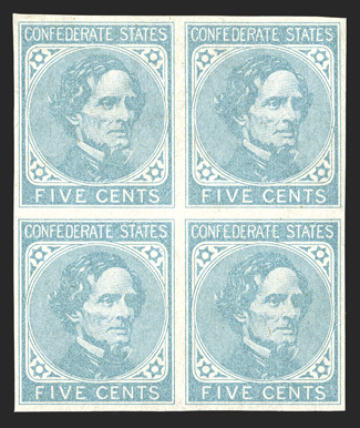 508 Pbl 6P5 Image#6P5, 5c Light blue, plate proof on wove, block of four, full margin all around, fresh and very fine; each signed Robson Lowe in pencil, as well as a photocopy of a 1976 PF certificate for the sheet of 400 from which this came. (Image) $600.00+