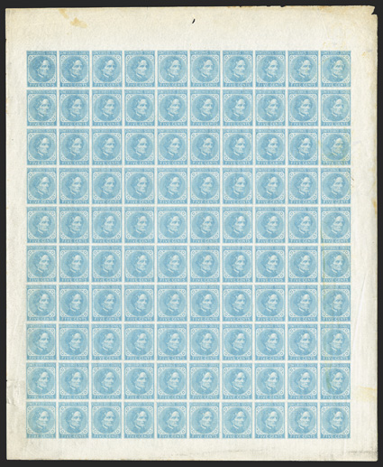 509 nhbl 7 Image#7, 5c Blue, Archer & Daly printing, complete pane of 100 with full selvage on all four sides, bright color, usual uneven o.g., n.h., gum stain shows though on five stamps in the last column, some selvage faults, very fine appearance; accompanied by a reprint sheet of 70 in red. (Image) $2,250.00+