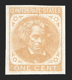 510 TC 14TC5 Image#14TC5, 1c Light yellow brown, trial color plate proof on wove, large margins, bright color (noted as orange on the certificate), very fine and scarce; pencil notation on back and accompanied by a photocopy of a 1976 PF certificate for the sheet of 200 from which this came. (Image) $800.00