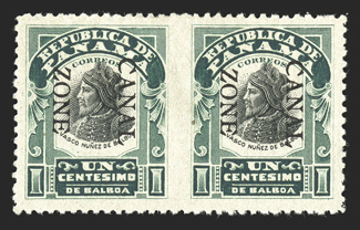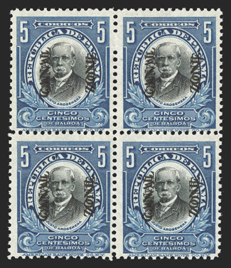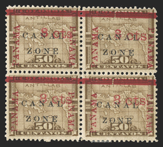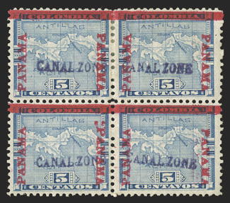 517 ogbl 33a Image#33a, 5c Deep blue and black, "Canal Zone" double, mint block of four, striking color that is incredibly deep and intense, fresh clean o.g., fine; very few blocks can exist as only a total of 200 of this error were printed. (Image) $1,500.00+
