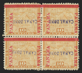 513 ogbl 3a Image#3a, 10c Yellow, inverted "Canal Zone" overprint, mint block of four, usual tropicalized o.g. with glassine interleaving, fine; this is one of only two blocks of the Ten Cent Inverted Overprint; certainly one of the key error multiples of the first issue; 2010 PSAG certificate; cataloged simply as four singles. (Image) $3,100.00+