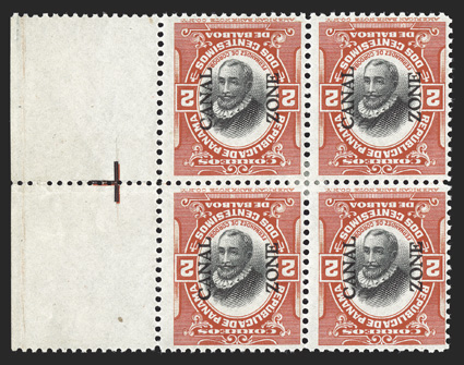 519 ogbl 39e Image#39e, 2c Vermilion and black, Center Inverted and "Canal Zone" inverted reading down, right margin block of four with control marker, brilliantly rich color, o.g., h.r., fine; blocks of this popular invert are rare. (Image) $2,600.00