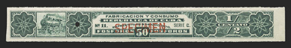 522 S   ImageCuba tax paid revenues with Specimen overprint, group of 29 different Alcoholic Beverage or Tobacco tax stamps with red "Specimen" and security punch, sixteen are in carmine and thirteen in green, without gum, very fine; from the American Bank Note Company Archives. (Image) Est. $150-200