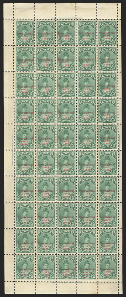 536 nhbl 55 Image#55, 1c Green with red Provisional Govt. overprint, complete sheet of 50 with selvages and imprints on all four sides, well centered and exceedingly fresh, o.g., stamps all never hinged, h.r.'s in the top selvage only, very fine; full sheets are scarce, especially in this choice quality. (Image) $225.00+