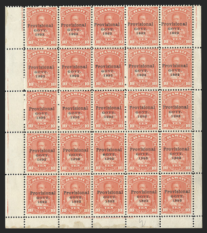 538 nhbl 67 Image#67, 10c Vermilion, with black Provisional Govt. overprint, bottom margin block of 25, with full imprint at bottom and partial imprints at sides, deep color, o.g., n.h., a few trivial toned specks on gum only, fine-very fine. (Image) $1,250.00+