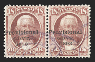 540 O 71a Image#71a, 18c Dull rose with black Provisional Govt. overprint, missing "9" in 1893", horizontal pair, the left stamp being the error (position 23 on the sheet), well centered, fresh color, purple town cancels, very fine; ex-Pietsch, Twigg-Smith. (Image) $535.00+