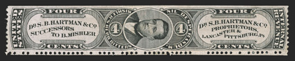 781 O RS99a Image#RS99a, Dr. S.B. Hartman & Co., 4c Black on old paper, faults as always, a couple sealed tears and some light staining, fine appearance. (Image) $2,250.00
