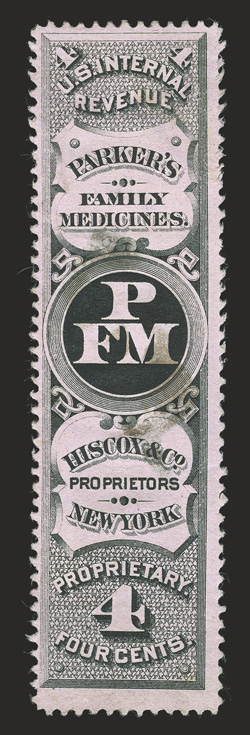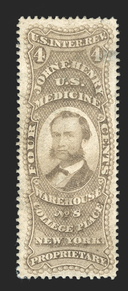 790 O RS123d Image#RS123d, Hiscox & Co., 4c Black on watermarked paper, an exceedingly choice example of this rare medicine stamp, it is believed that there are about a dozen of this issue known and all of these are faulty in some way, this copy has small faults, mostly thins and a small tear, attractively centered and very fine appearance; ex-Cunliffe. (Image) $2,250.00
