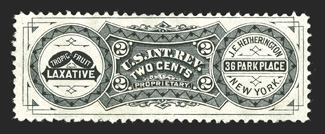 783 O RS99d Image#RS99d, Dr. S.B. Hartman & Co., 4c Black on watermarked paper, especially bright color, minor thin spot and a small neat repair at right, fine appearance; despite the minor repair, this is in far superior condition to most we have seen. (Image) $1,900.00