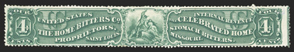 791 O RS130d Image#RS130d, The Home Bitters Co., 4c Green on watermarked paper, deep intense color and impression, shows part imprint in the right margin, minor thin spots, very fine appearance; ex-Joyce. (Image) $400.00
